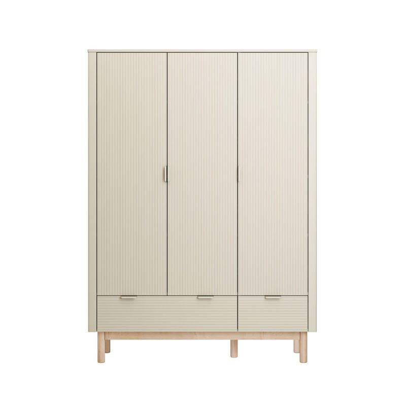 De elegante kinderkamer kast is uniek door het gestreepte patroon en het beukenhout. Dankzij de extra deur en 2 lades onderaan biedt de kast erg veel opbergruimte. De lades en de deuren zijn uitgerust met hoogwaardige geleiders met een soft close-systeem, waardoor de lade en de deuren zachtjes sluiten met een zelfsluitende functie. De kledingkast heeft een afmeting van 144,2 (l) x 52,4 (b) x 197,8 (h) cm. Het is gemaakt van laminaatplaat, MDF, massief beukenhout. Veiligheid en duurzaamheid worden gegarandeerd door het gebruik van gecertificeerde verven die voldoen aan de norm EN 71-2. De kast is gecertificeerd met de EN16516-norm.