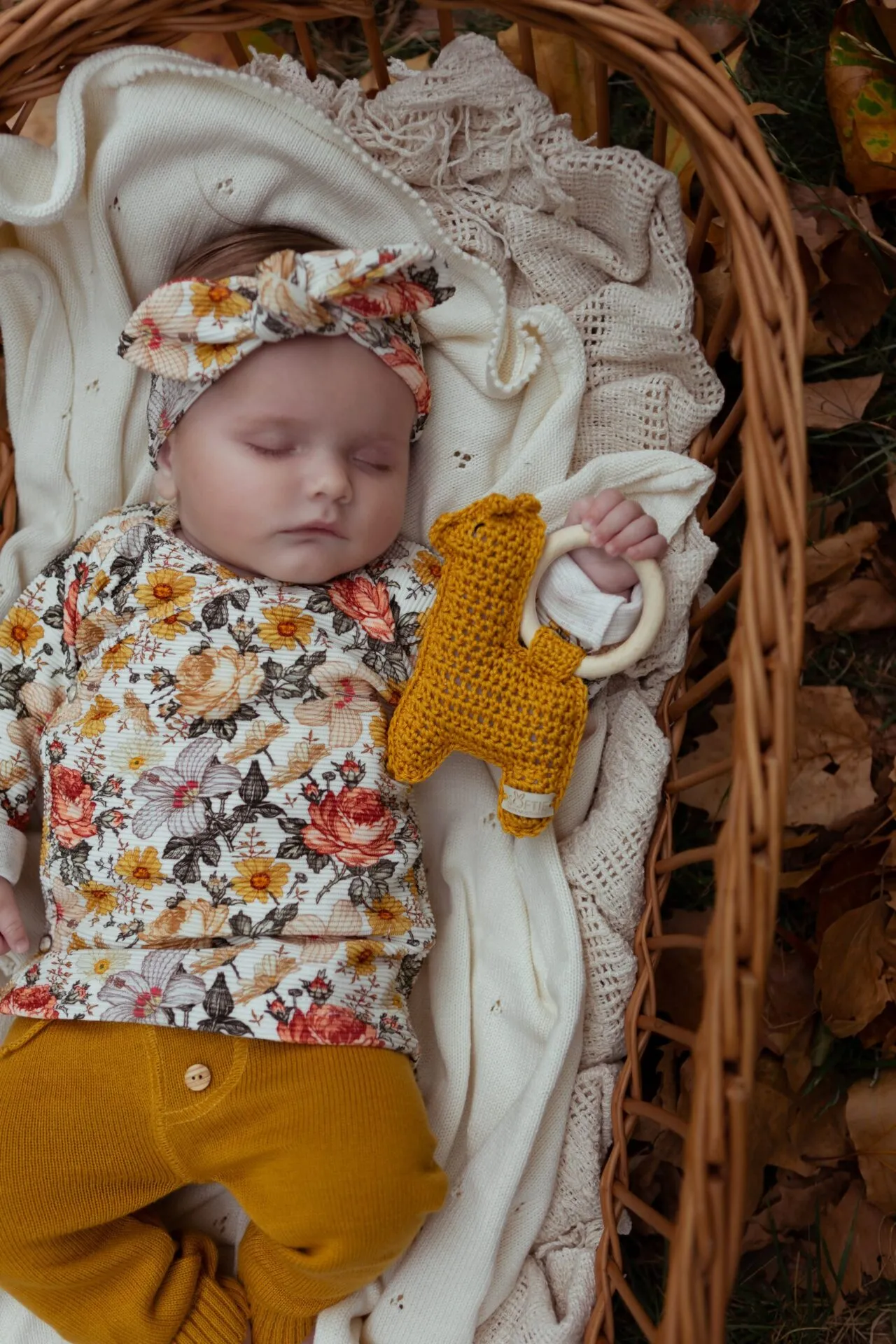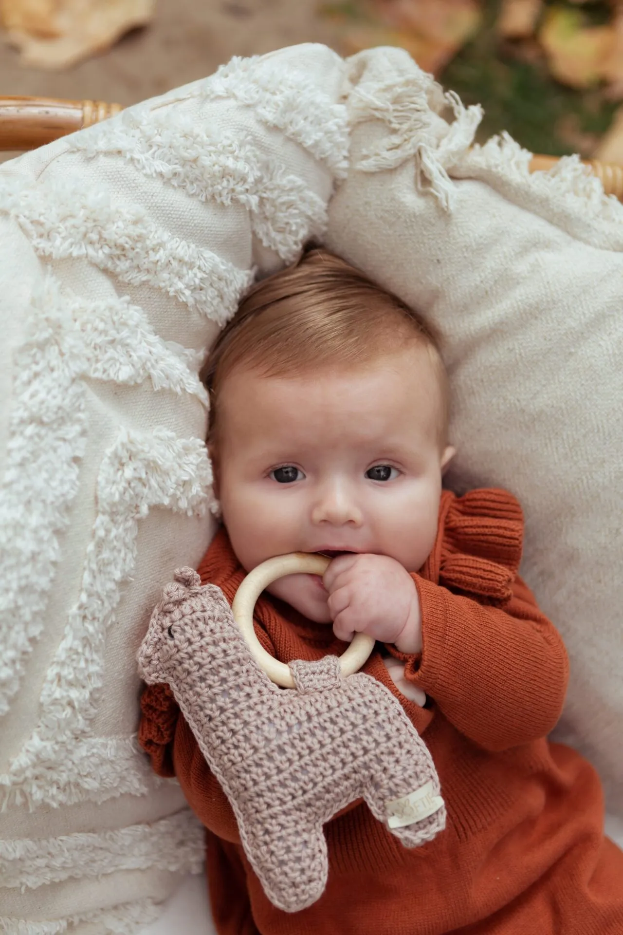 Deze rammelaar bestaat uit een onbehandeld houten ring, katoengaren met Oeko-Tex keurmerk.