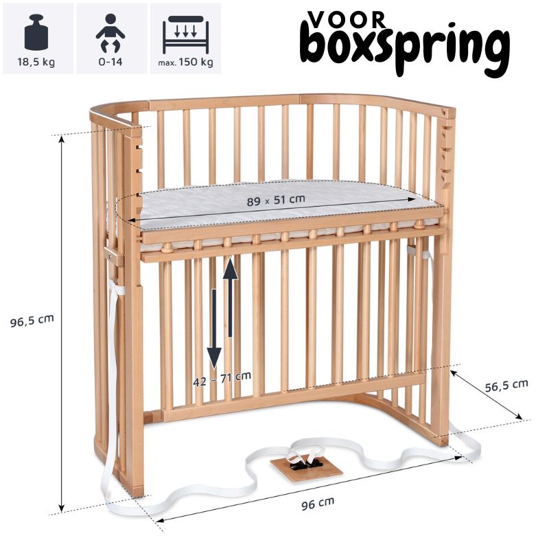 De co-sleeper wieg beige is een bijzondere mix van elegantie, comfort, geborgenheid & hoge kwaliteit. De wieg is van hoge kwaliteit door de materiaalkeuze van 100% beukenhout met verf op waterbasis, veilig volgens de EU norm EN71-3. Het wiegje voor een boxspring bed heeft een afmeting van 96 cm (lengte), 56,50 cm (diepte), 96,5 cm (hoogte). Ideaal dus voor naast een (hoge) boxspring bed. Het wiegje voor een normaal bed of futon bed heeft een afmeting van 97 cm (lengte), 56,50 cm (diepte), 79 cm (hoogte). Geschikt voor een baby met de leeftijd 0 tot 6-9 maanden.