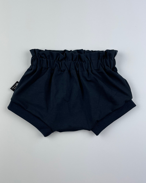Handgemaakte bloomer in de stof donkerblauw. De bloomer is gemaakt van een zachte en rekbare katoen. Dit zorgt ervoor dat de kleding gemakkelijk aangaat en heerlijk zit. De stof heeft een effen donkerblauwe kleur.