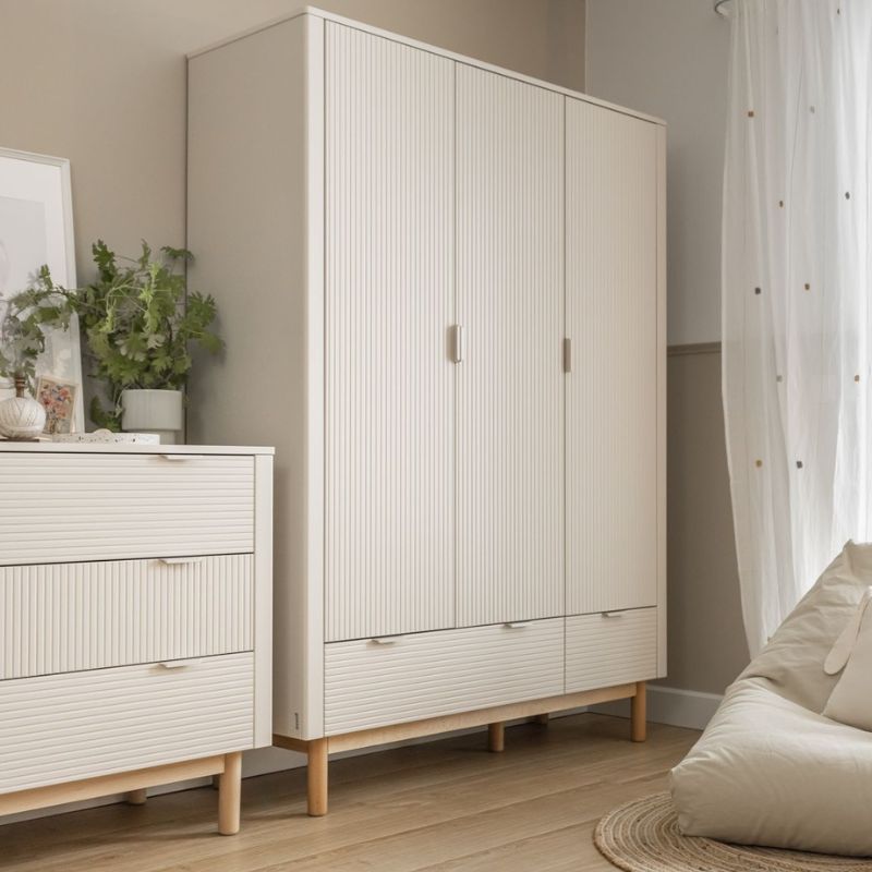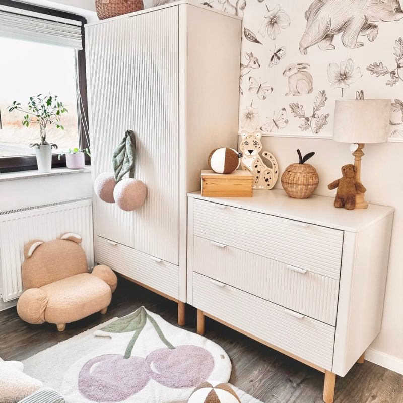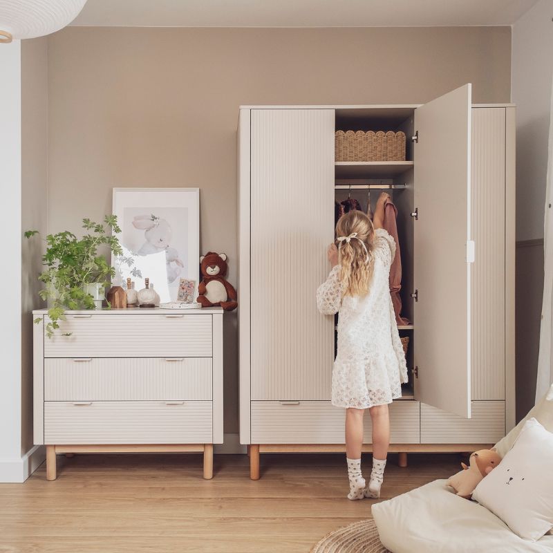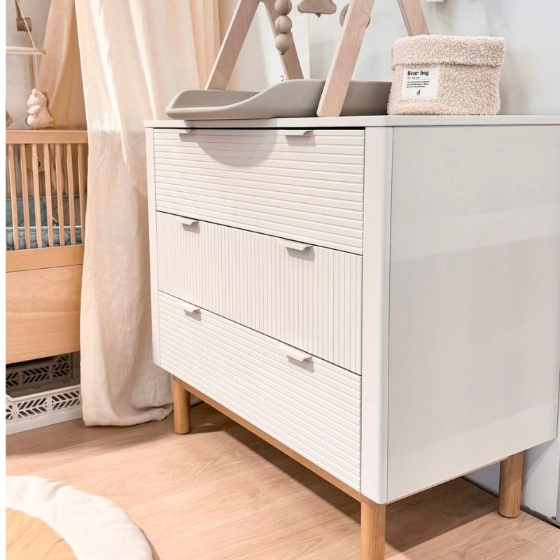 De elegante commode ladekast is uniek door het gestreepte patroon, de chique champagnekleur en de beukenhouten pootjes. Dankzij drie ruime lades biedt de ladekast veel opbergruimte. Laden zijn uitgerust met hoogwaardige geleiders met een soft close-systeem, waardoor de lades zachtjes sluiten met een zelfsluitende functie. De commode heeft een afmeting van 100,2 (l) x 52,4 (b) x 90,4 (h) cm. De commode is gemaakt van laminaatplaat, MDF, massief beukenhout. In deze handleiding vindt je de informatie om de commode in elkaar te zetten. Om de veiligheid te garanderen, is de oppervlak van het dressoir bedekt met gecertificeerde verf die volledig voldoet aan EN 71-2. De commode is gecertificeerd met de EN16516-norm.