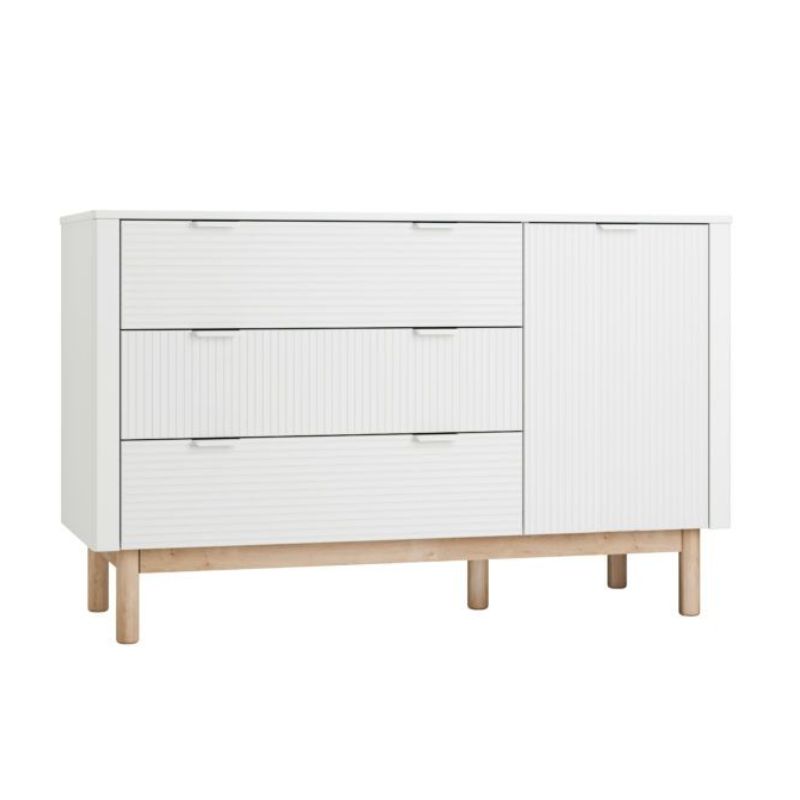 De elegante commode ladekast is uniek door het gestreepte patroon en de beukenhouten pootjes. Dankzij drie ruime lades en een extra deurtje aan de rechterkant biedt de ladekast veel opbergruimte. Laden zijn uitgerust met hoogwaardige geleiders met een soft close-systeem, waardoor de lades zachtjes sluiten met een zelfsluitende functie. De deur is aan beide kanten naast de lades te plaatsen. Je kunt de deur dus aan de linkerkant maken, maar ook aan de rechterkant. De commode heeft een afmeting van 144,5 (l) x 52,4 (b) x 90,4 (h) cm. Het is gemaakt van laminaatplaat, MDF, massief beukenhout. In deze handleiding vindt je de informatie om de commode in elkaar te zetten. De ladekast is geverfd met veilige en gecertificeerde verf volgens EN 71-2. De commode is gecertificeerd met de EN16516-norm.