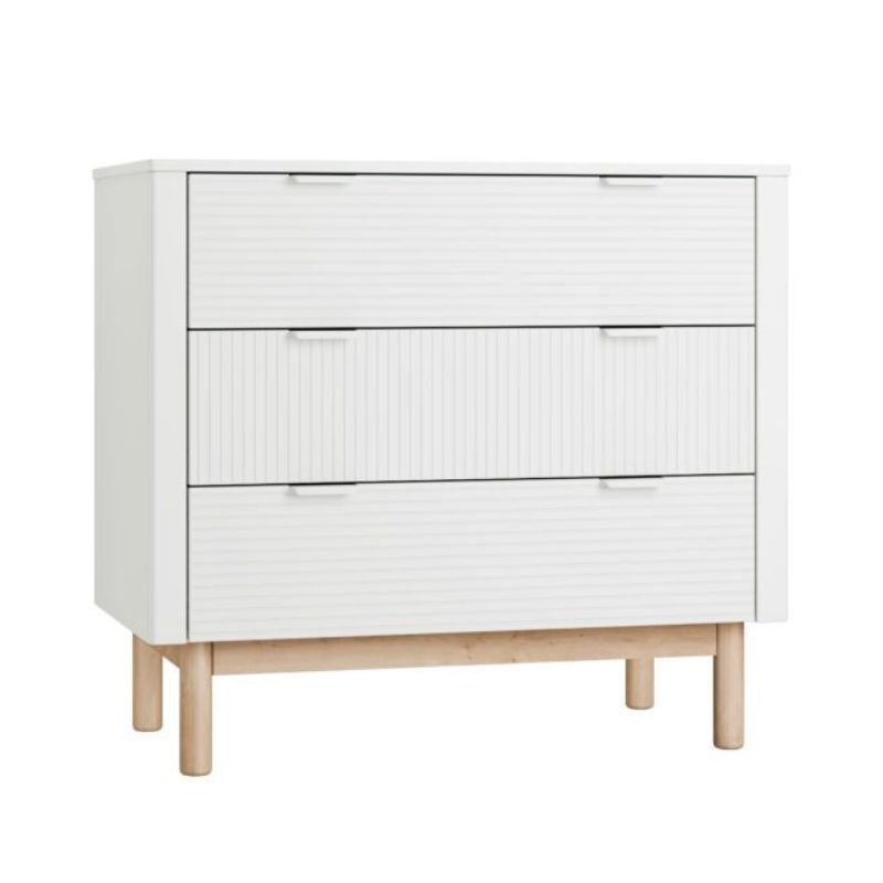 De elegante commode ladekast is uniek door het gestreepte patroon, de chique witte kleur en de beukenhouten pootjes. Dankzij drie ruime lades biedt de ladekast veel opbergruimte. Laden zijn uitgerust met hoogwaardige geleiders met een soft close-systeem, waardoor de lades zachtjes sluiten met een zelfsluitende functie. De commode heeft een afmeting van 100,2 (l) x 52,4 (b) x 90,4 (h) cm. De commode is gemaakt van laminaatplaat, MDF, massief beukenhout. In deze handleiding vindt je de informatie om de commode in elkaar te zetten. Om de veiligheid te garanderen, is de oppervlak van het dressoir bedekt met gecertificeerde verf die volledig voldoet aan EN 71-2. De commode is gecertificeerd met de EN16516-norm.