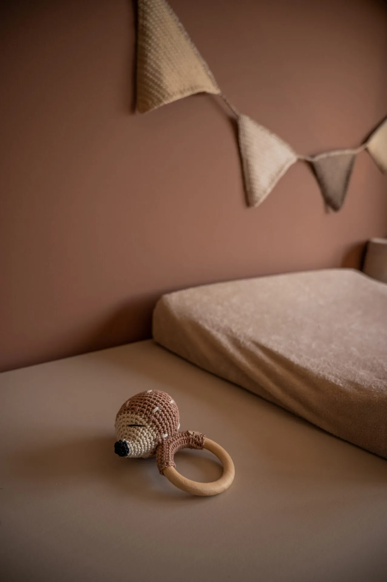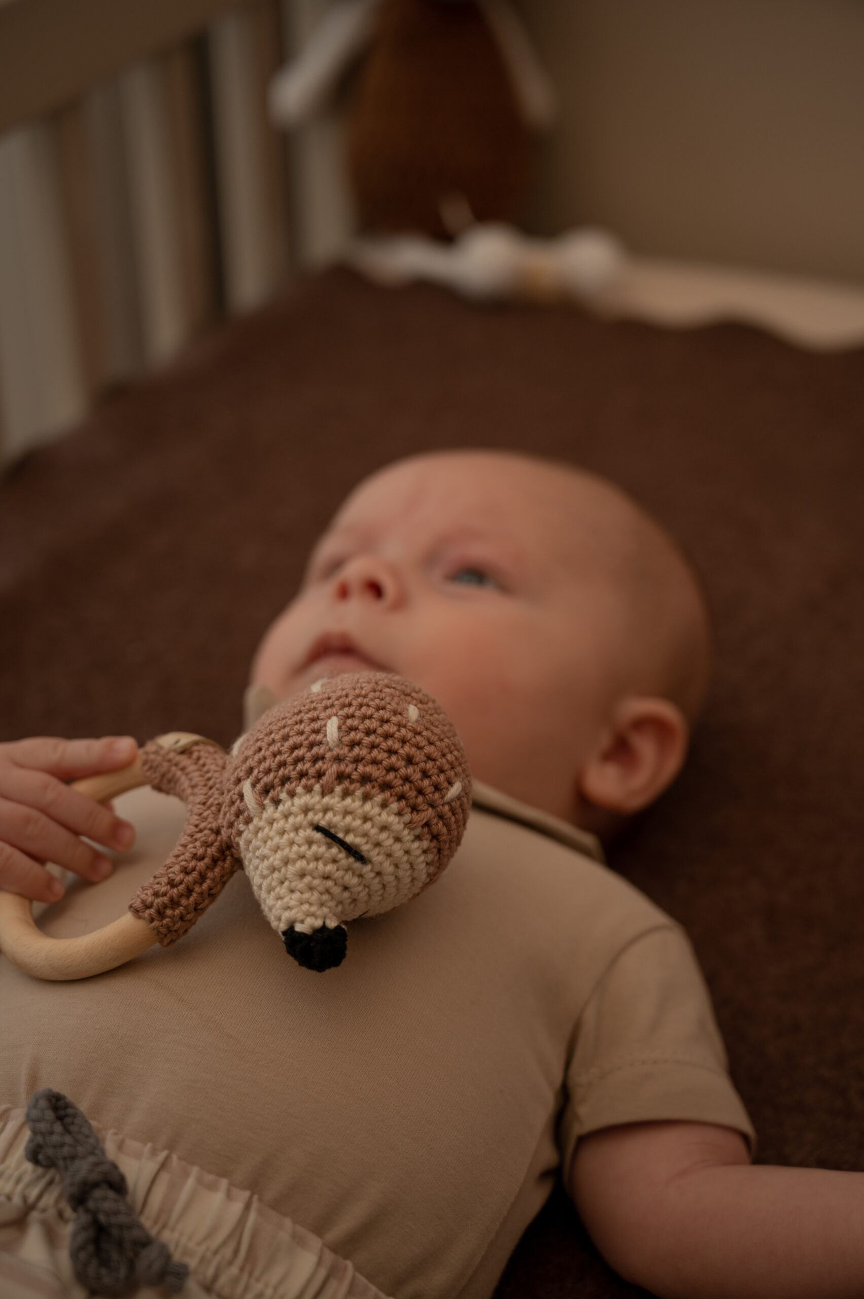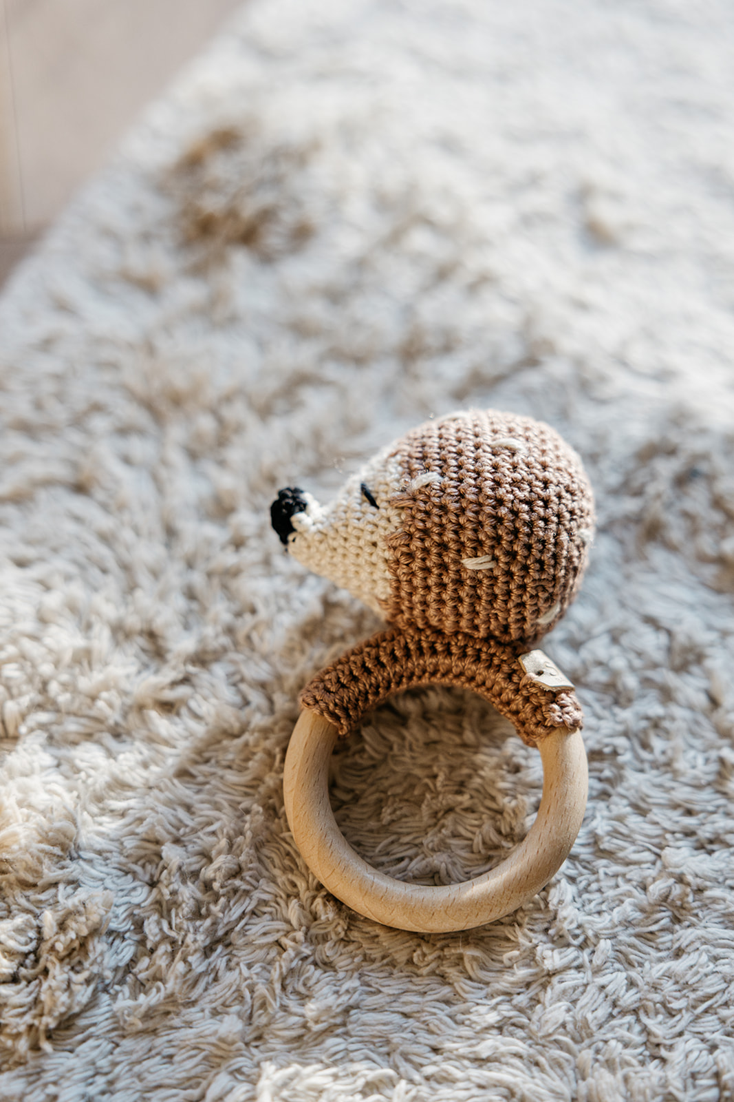 Deze egel rammelaar bestaat uit een onbehandeld houten ring, katoengaren met Oeko-Tex keurmerk.