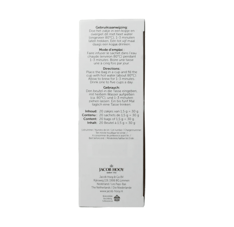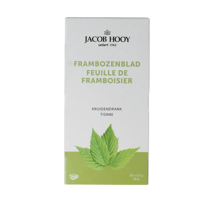 Deze Frambozenblad Thee van Jacob Hooy bevat 20 zakjes frambozenbladthee van 1,5 gram per zakje.