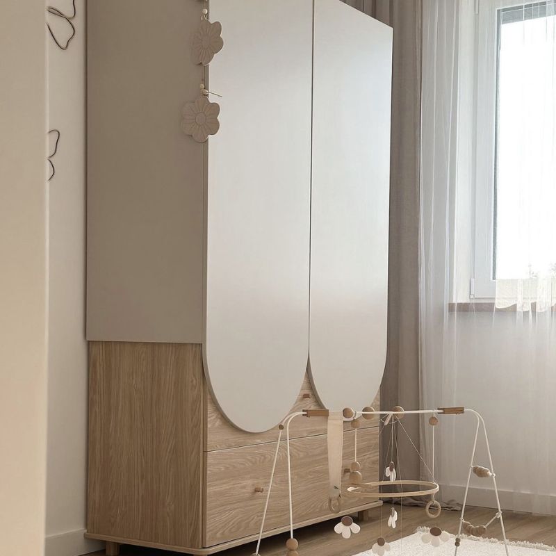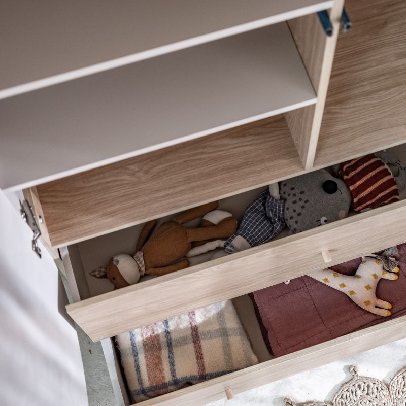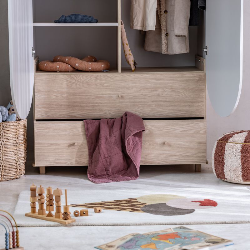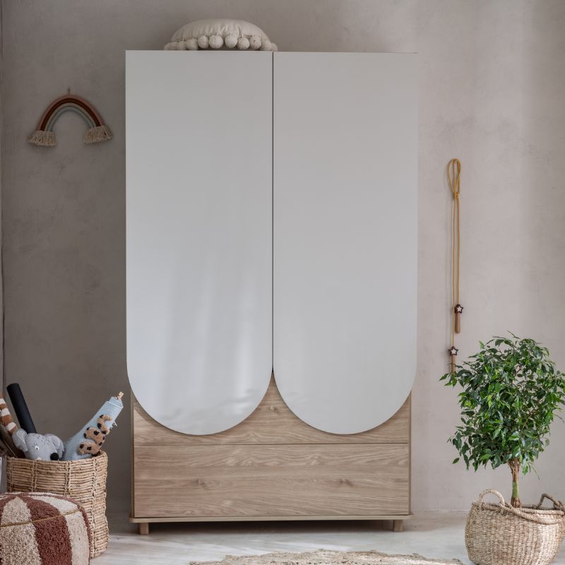 De mooie, speelse kinderkamer kledingkast is uniek door de ronde vormen van de deuren. Het geeft de babykamer een bijzondere stijl. De kast heeft ruimte voor het ophangen van kinderkleding voor pasgeborenen, peuters en kleuters. Het kastje heeft planken en aan de onderkant een lade.