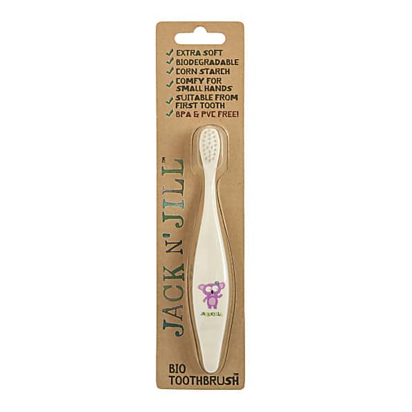 Deze kindertandenborstel van Jack n’ Jill heeft een vrolijke Koala op het handvat. Het ergonomisch gevormde handvat is gemaakt van 100% maïszetmeel en is daarmee (net als de verpakking) biologisch afbreekbaar. De tandenborstel met afgeronde zachte haartjes is speciaal ontwikkeld voor het poetsen van de eerste tandjes.