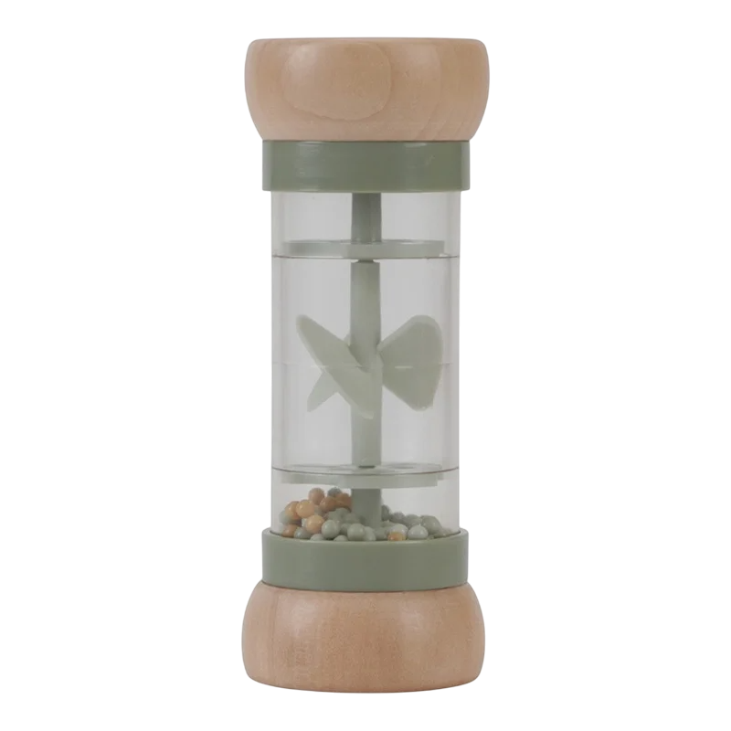 Schud en rammel! Draai de regenrammelaar om en luister naar de rustgevende druppelgeluidjes van de balletjes die van de ene naar de andere kant van de regenmaker bewegen. Het stimuleert de zintuiglijke ontwikkeling en het muzikale talent van de baby. De balletjes, vallen door kleine openingen in de buis en laten de propeller draaien, wat resulteert in een aangenaam geluid. De regenrammelaar is ontworpen voor kleine handjes en ligt lekker in de hand. De houten boven- en onderkant zijn versierd met een tekening van een schaap en een kip en uit de Little Farm collectie.