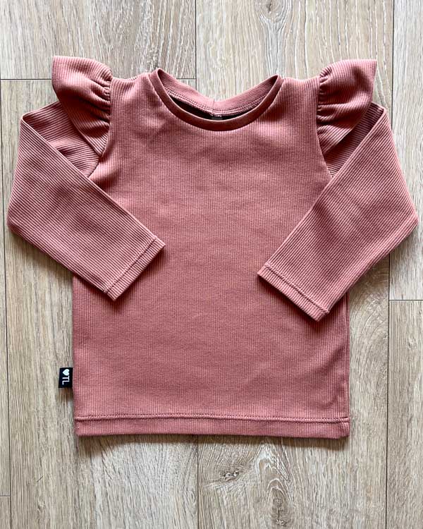 Handgemaakte longsleeve in de stof roze klei (fijne rib). De longsleeve is gemaakt van een zachte en rekbare katoen. Dit zorgt ervoor dat de kleding gemakkelijk aangaat en heerlijk zit. De stof is een fijne rib in de klei roze kleur.