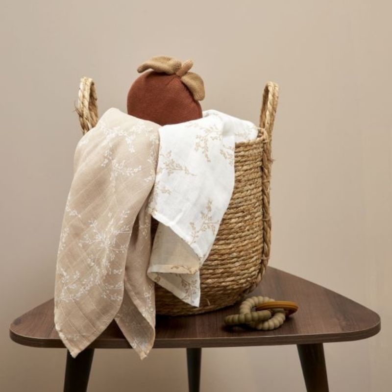 Een printje uit de natuur zoals takken en bloemetjes design is hartstikke leuk om te combineren met rustige natuurtinten. Stijl je wiegje en/of ledikant samen met een hydrofiele doek met printje als eyecatcher in het babybedje. Vouw de doek 1x in de vorm van een driehoek. Leg het doek neer waar de baby met zijn of haar hoofdje komt te liggen (spuugdoek). Zorg ervoor dat de punt naar beneden ligt en de zijkanten goed strak weggestopt worden onder het matras, zodat de baby de doek niet los kan trekken. Voilá, een hip opgemaakt babybedje staat klaar om de baby te verwelkomen!