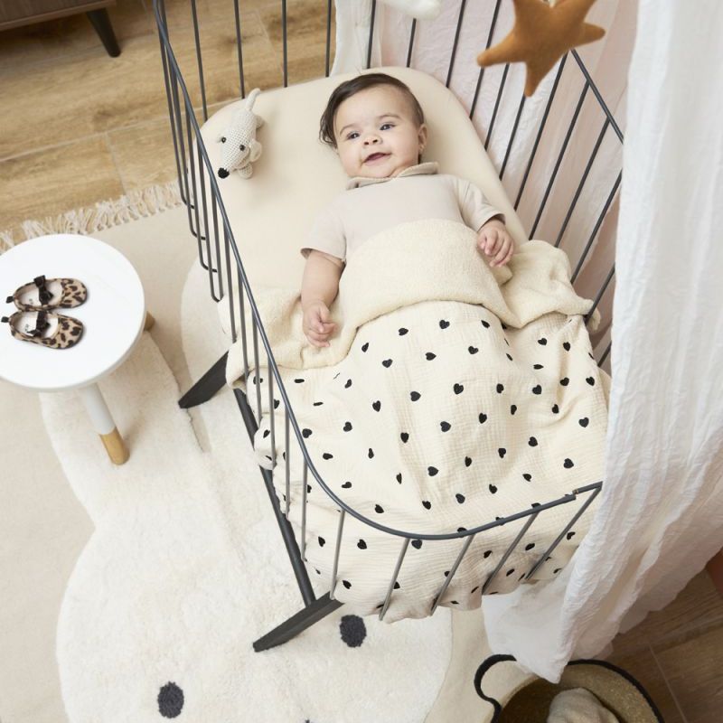 Het dekentje is gemaakt van 100% katoen, wat perfect is voor de gevoelige huid van je baby. De bovenkant is van een fijne hydrofiele stof en heeft een speelse print van zwarte hartjes. De onderzijde voelt heerlijk zacht aan dankzij het badstof materiaal. Met een afmeting van 75×100 cm is deze deken ideaal voor in de wieg, reiswieg of co-sleeper. En natuurlijk ook perfect om samen lekker te knuffelen, of je nu thuis bent of onderweg! De deken heeft TOG-waarde 1.5. Hoe hoger de TOG-waarde hoe warmer het product voor jouw kleintje.