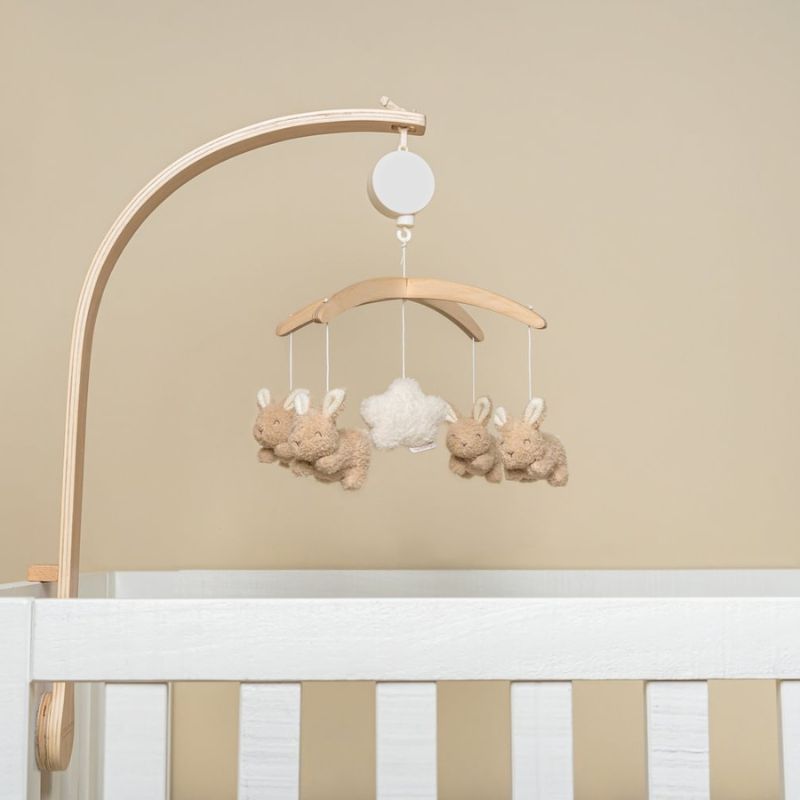 De muziekmobiel Baby Bunny is erg geschikt voor ouders die graag de beige baby trend volgen. De babymobiel is stijlvol en elegant te combineren in elke moderne babykamer. De standaard is van kwalitatief hout vervaardigd en kun je makkelijk vastdraaien aan de box.