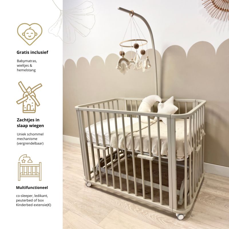 - Alles-in-één babybed, peuterbed, cosleeper, box;