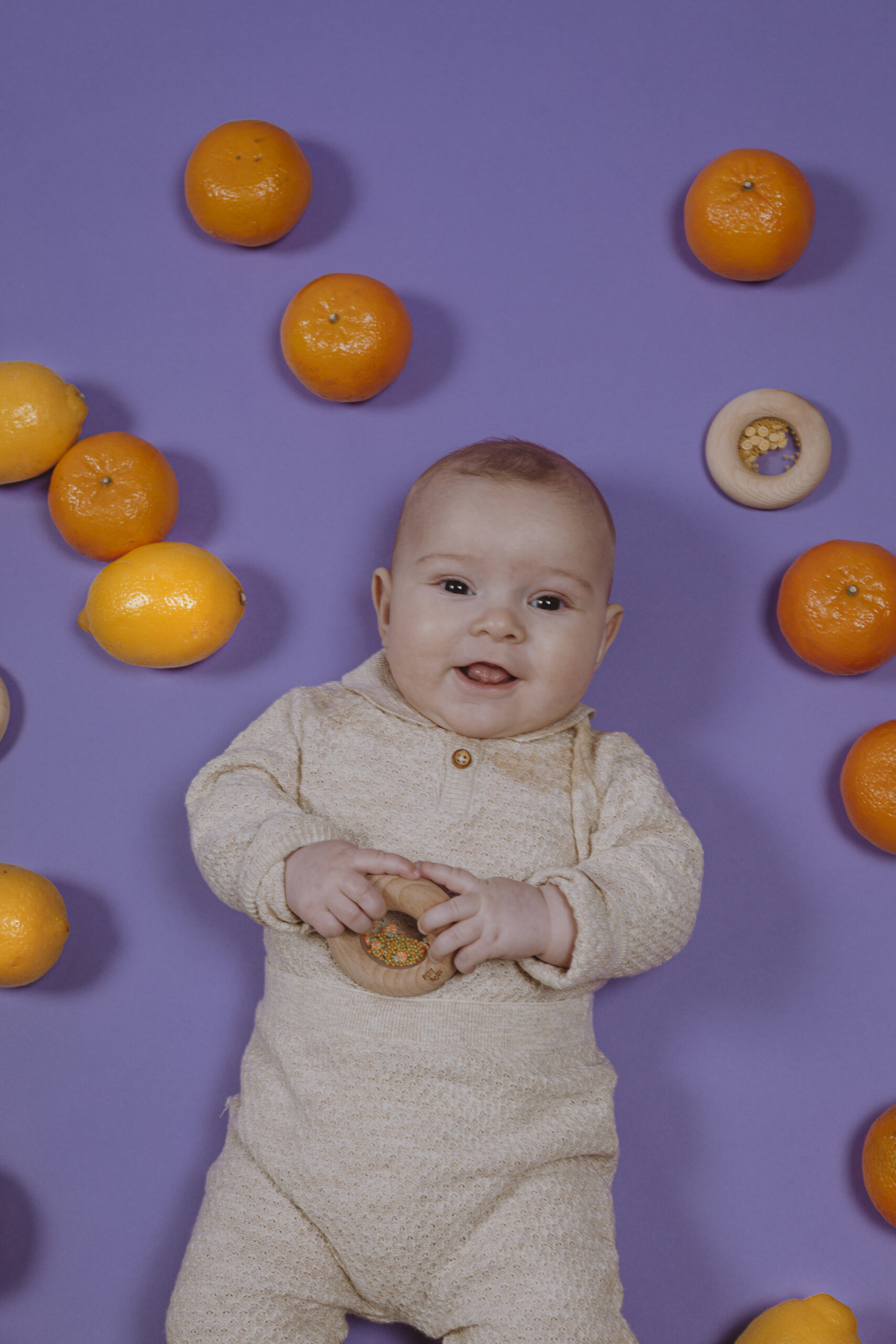 Deze sensorische donut is een houten rammelaar en een bijtring in één. Ideaal zintuiglijk speelgoed om door jong en oud te verkennen.