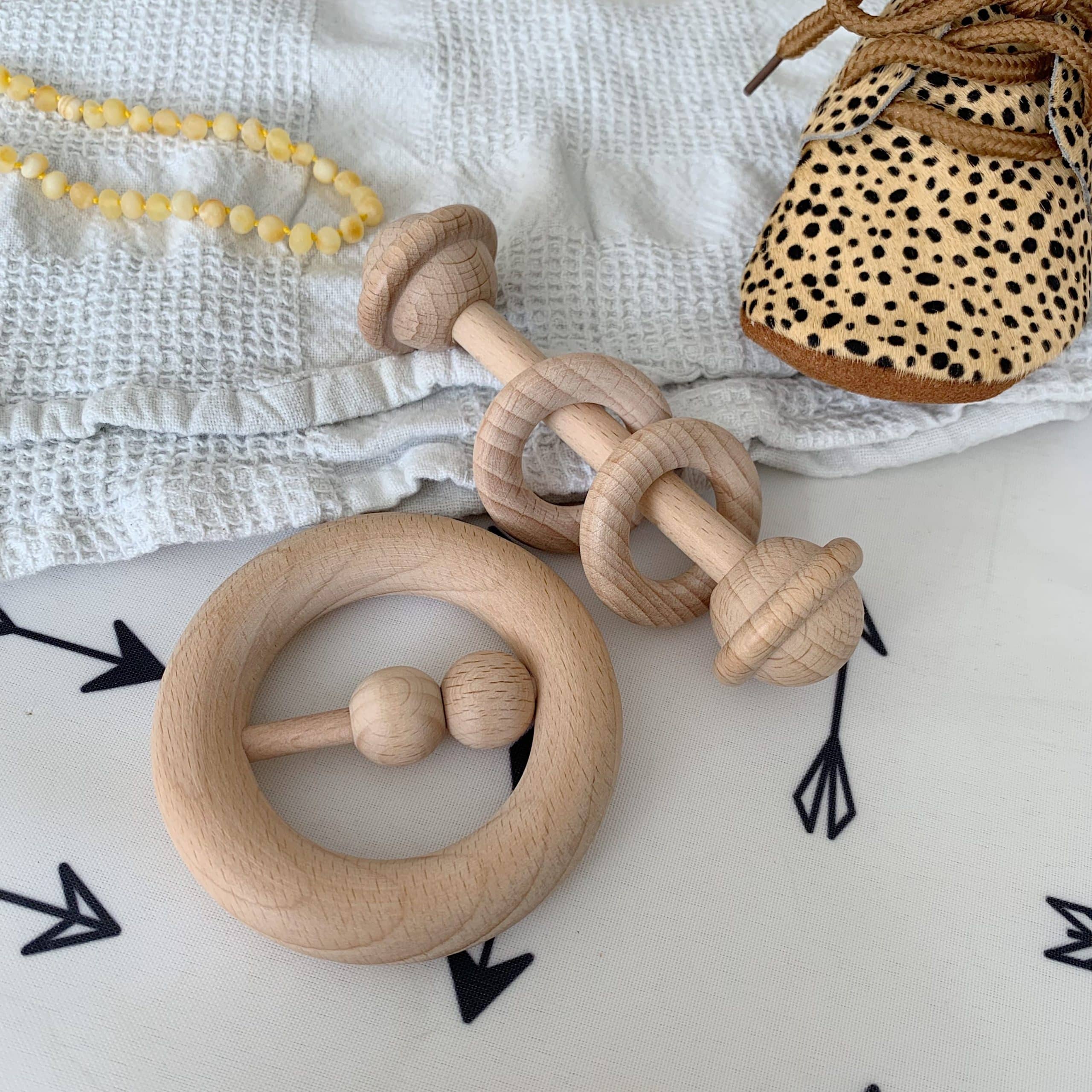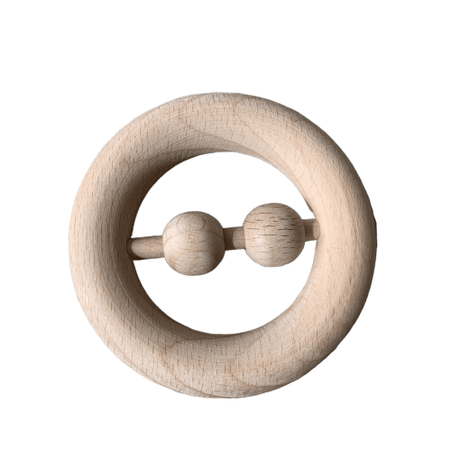 Deze rammelaar is van beukenhout gemaakt en ook fijn om in te bijten bij doorkomende tandjes. De rammelaar is speciaal gemaakt voor kinderhandjes en is makkelijk om vast te houden. Naast dat hij onwijs leuk is om mee te spelen is hij helemaal stylish verantwoord.