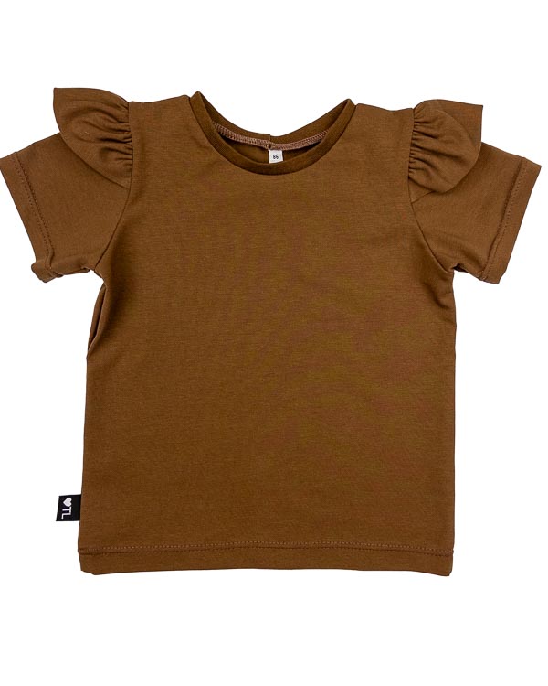 Handgemaakt shirt in de stof donkerbruin. Het shirt is gemaakt van een zachte en rekbare katoen. Dit zorgt ervoor dat de kleding gemakkelijk aangaat en heerlijk zit. De stof heeft een effen donker bruine kleur.