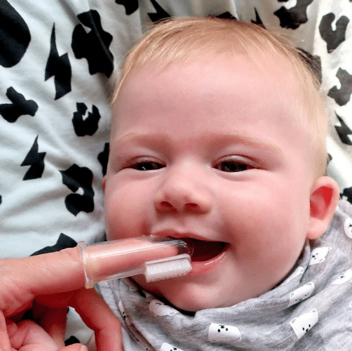 – gebruik de borstelzijde om zachtjes de baby’s eerste tandjes te poetsen;