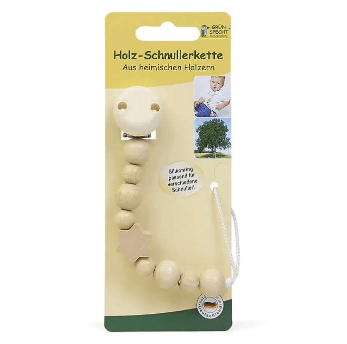 Deze praktische Grünspecht speenketting van esdoornhout wordt met de hand vervaardigd in Duitsland. Dankzij de natuurlijke eigenschappen van het hout kunnen de kleuren licht variëren. De ketting is perfect om de kleine metgezellen van je baby zoals fopspenen, bijtringen, rammelaars of bijtwortels stevig vast te maken. Zo blijft alles op zijn plek en altijd binnen handbereik. Het speenkoord wordt vervolgens met de clip aan de kleding van je kindje bevestigd, zodat deze altijd dichtbij is. Het koord heeft een veilige lengte van 21 cm.