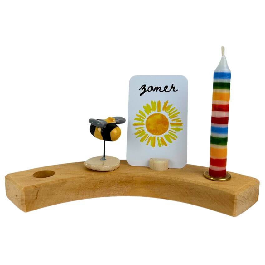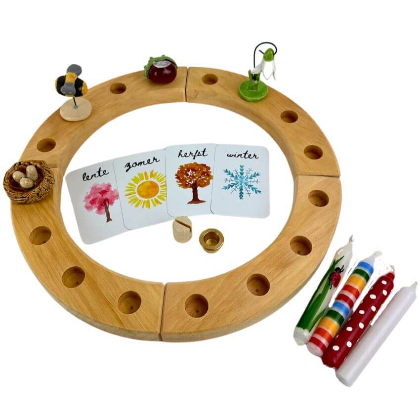 De startset bevat als basis een grote jaarring van Grimm’s, messing kaarsenhouder en houten kaarthouder steker. Plus voor ieder seizoen een seizoenskaartje in kleur, kaarsje en steker van keramiek (nestje met eitjes voor de lente, bijtje voor de zomer, kastanje voor de herfst en sneeuwklokje voor de winter).