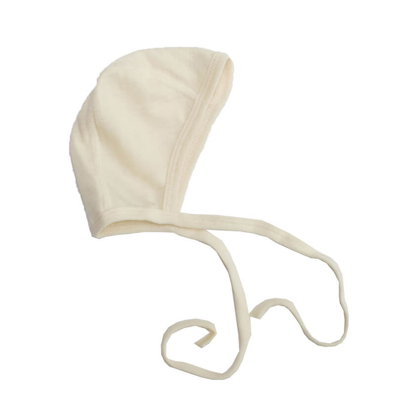 Dit strikmutsje in lichte ribstof van het merk Popolini / iobio is gemaakt van 70% biologische wol en 30% zijde. GOTS gecertificeerd.